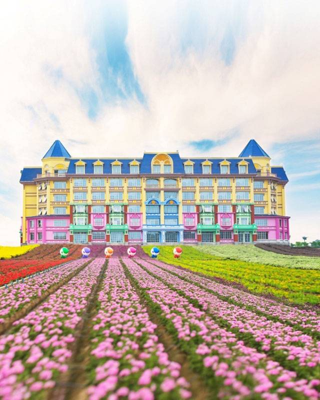 在欧式城堡的尖屋顶下,各种缤纷的色彩装饰着屋檐、墙体、窗棂、门框,呼应着酒店建筑外环绕着的百万花田,置身其中,仿佛走进了安徒生童话。无论从哪个角度眺望过去,城堡都呈现一种360度无死角的美丽。