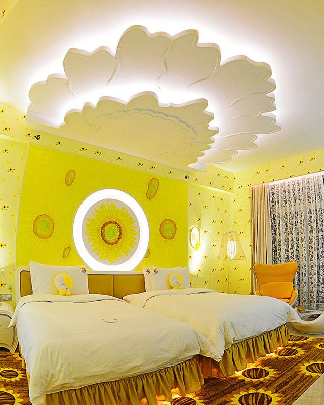 酒店房间以百万葵园的吉祥物与具有浪漫花语的鲜花为六大设计理念,酒店每一层是不同“花”主题的高级客房。从一层到六层,分别是葵花猫动漫房、薰衣草、樱花、玫瑰花、向日葵、郁金香主题花房,各具韵味,充满梦幻。